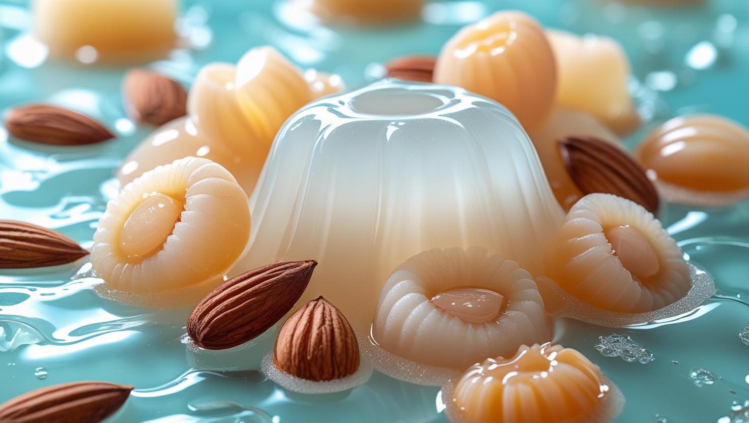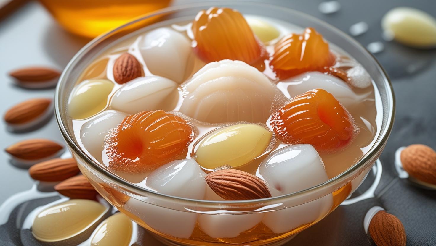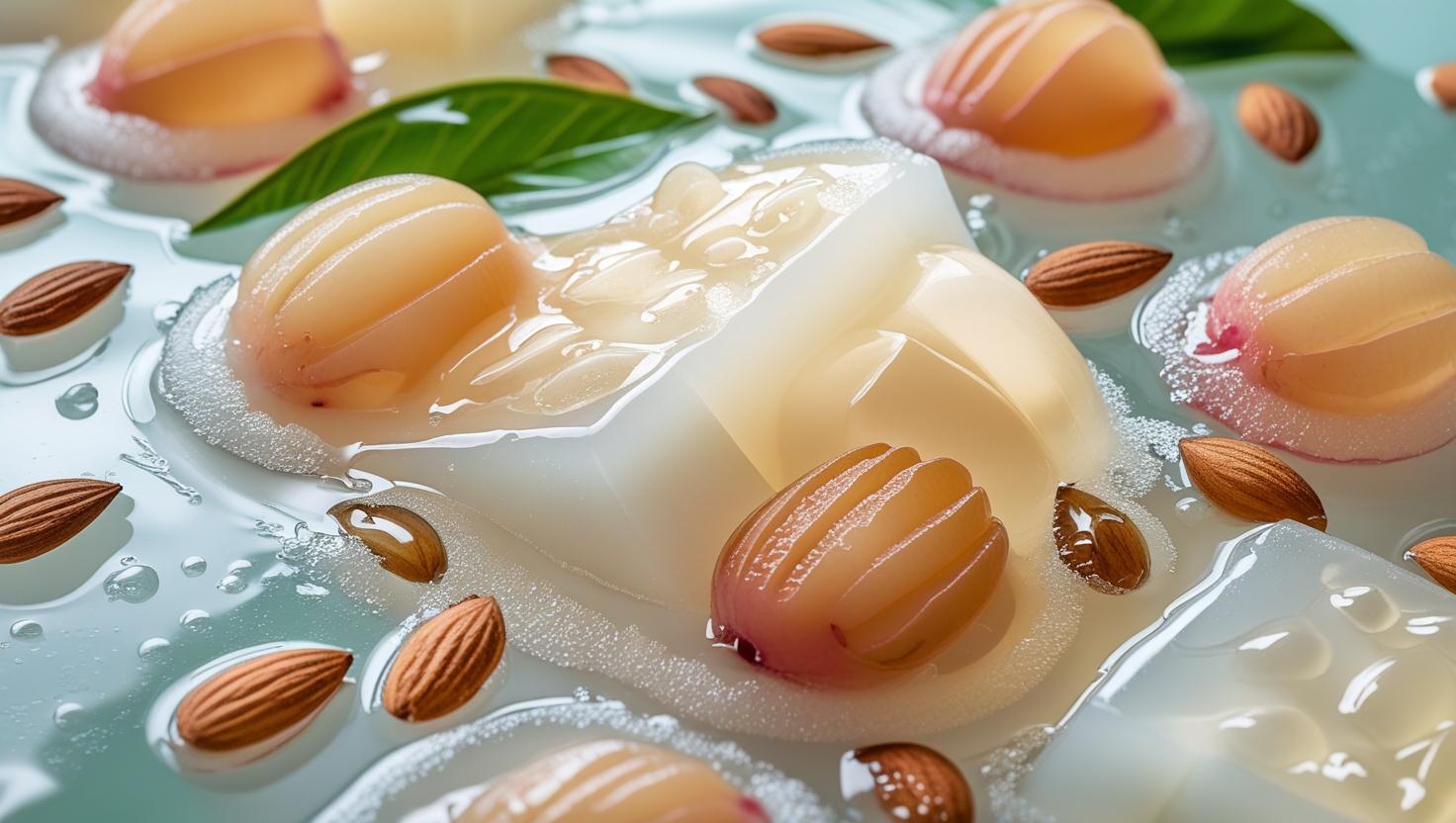 Thạch sữa mềm, kết hợp hạnh nhân, vải/nhãn tươi, nước đường thanh mát, ăn lạnh cực ngon.
