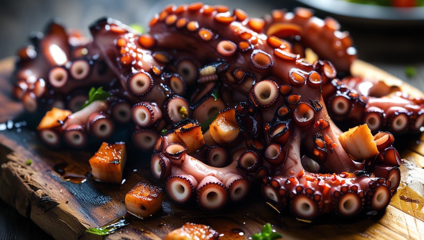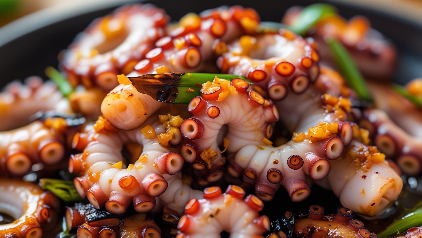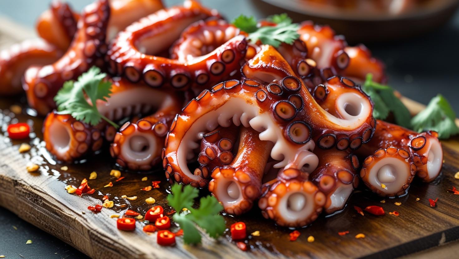 Bạch tuộc tươi, cắt khoanh vừa ăn, ướp sa tế ớt tươi cay nhẹ, nướng lửa to cho chín tới, giữ nguyên độ giòn sần sật và vị ngọt tự nhiên của hải sản.