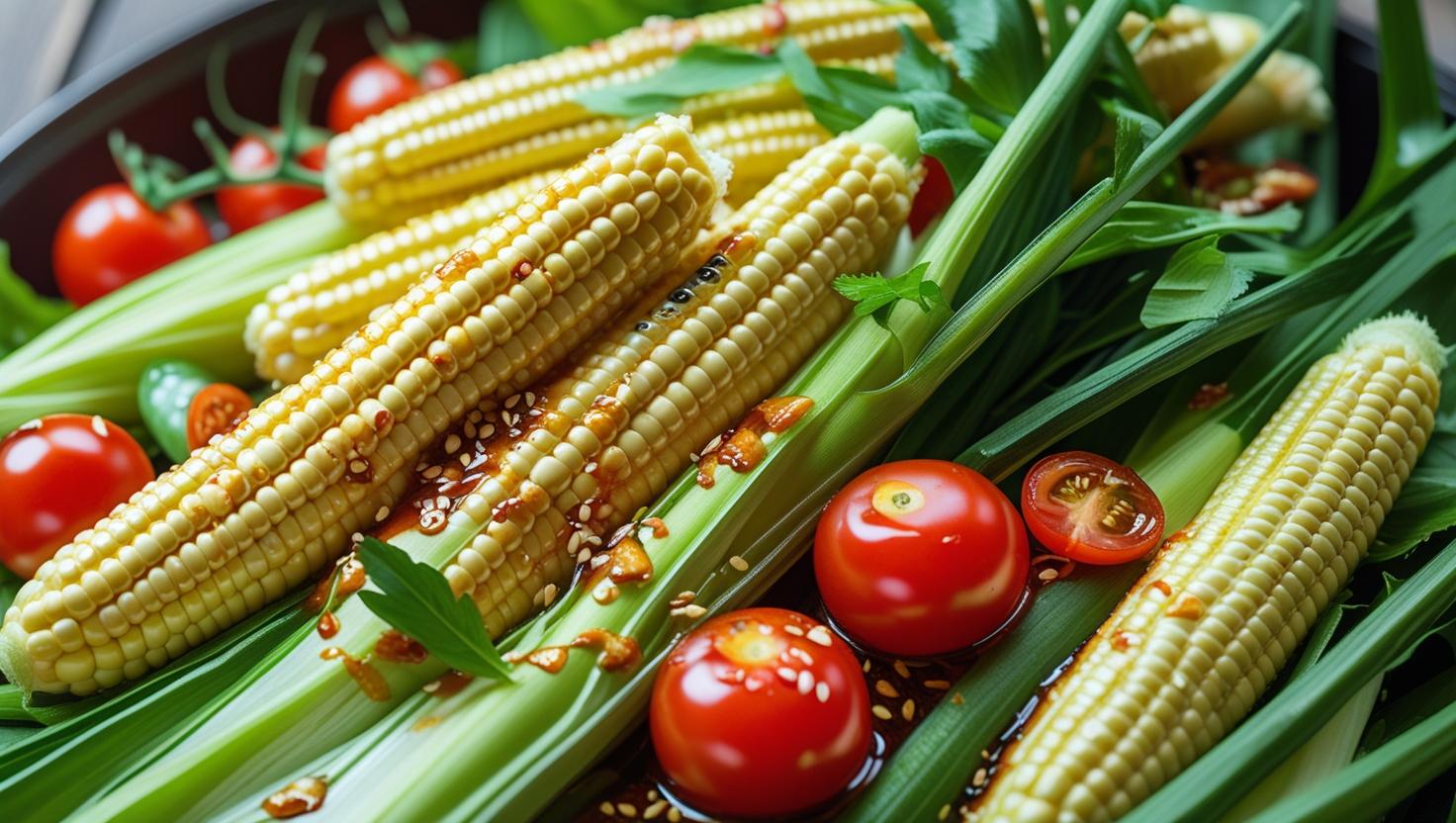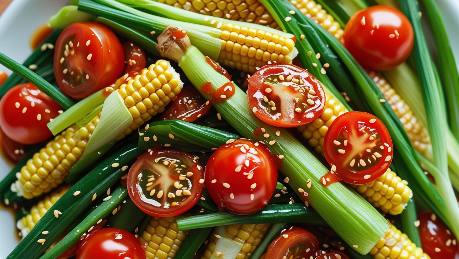 Rau xanh tươi, bắp non, cà chua bi, trộn sốt mè rang Nhật, vị thanh mát, mở vị giác cho bữa tiệc nướng