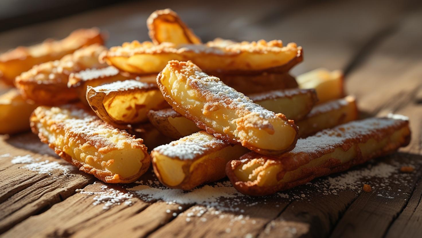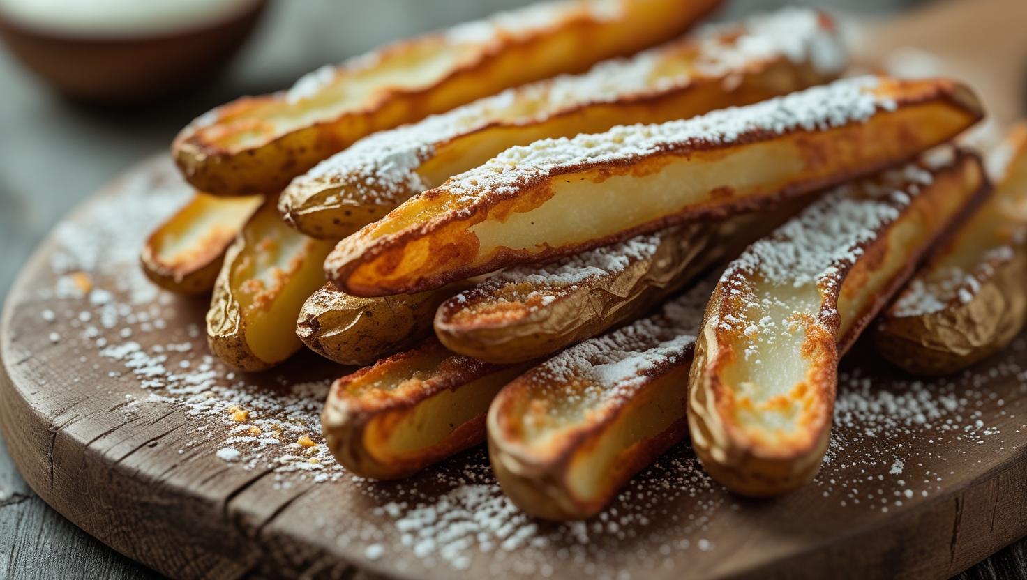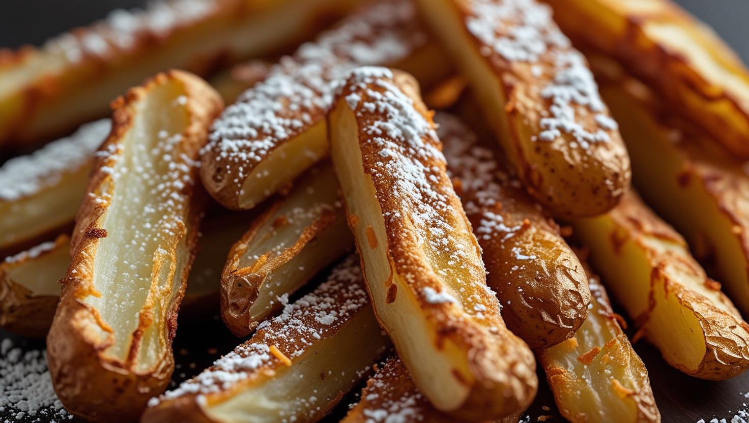 Khoai tây cắt que lớn, chiên hai lần cho vỏ ngoài giòn tan, trong mềm mịn, rắc nhẹ phô mai bột.